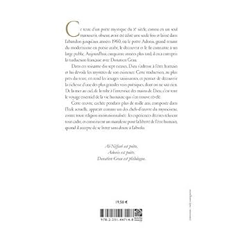 Ce texte d’un poète mystique du Xe siècle, connu en un seul manuscrit, obscur, avait été édité une seule fois et laissé dans l’abandon jusqu’aux années 1960, où le poète Adonis, grand tenant du modernisme en poésie arabe, le découvrit et le fit connaître à un large public. Aujourd’hui, cinquante années plus tard, il en a entrepris la traduction française avec Donatien Grau.Dans ces soixante-dix-sept extases, Dieu s’adresse à l’être humain et lui dévoile les mystères de son existence. Cette traduction, au plus près du texte, en rend les images saisissantes, et permet de découvrir la richesse d’une des plus grandes voix poétiques, dont on ne sait rien. De la mer au ciel, de la robe à l’interstice des mains de Dieu, c’est tout le voyage essentiel de la vie humaine qui s’en trouve révélé. Cette oeuvre, cachée pendant plus de mille ans, composée dans l’Irak actuelle, apparaît comme un des chefs-d’oeuvre du mysticisme, contre toute religion institutionnalisée : les expériences décrites refusent tout cadre, et constituent un manifeste pour la liberté de l’être humain, quand il accepte de se livrer sans doute à l’absolu.