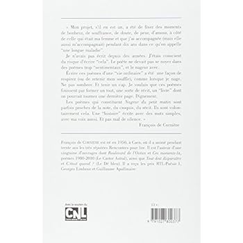(Texte provisoire) Nageur du petit matin est le sixième livre de François de Cornière édité par Le Castor Astral. Un long compagnonnage. Mais au-delà du suivi d'un auteur, il s'agit avant tout du partage d'une épreuve due aux vicissitudes de la vie. Cet ouvrage bouleversant sur le cancer et un amour transcendé par la souffrance marque le grand retour d'un poète essentiel. Rarement aura-t-on été aussi loin en poésie, dans un chant d'espoir au-delà de la mort : " Mon projet, s'il en est un, a été de fixer des moments de bonheur, de souffrance, de doute, de peur, d'amour, à côté de celle qui était ma femme et que j'ai accompagnée (mais elle aussi m'accompagnait) pendant dix ans, dans ce qu'on appelle une "longue maladie". " François de Cornière François de Cornière est né en 1950, à Caen, où il a animé pendant vingt-cinq ans les très réputées " Rencontres pour lire ". Il est l'auteur d'une vingtaine d'ouvrages, tant en prose qu'en poésie, dont Boulevard de l'Océan et Ces moment-là, poèmes 1980-2010 (Le Castor Astral), ainsi que Tout doit disparaître et C'était quand ? (Le Dé bleu). Sa poésie, qui s'appuie sur le quotidien d'un homme, par captations d'instants, pour filtrer le temps qui passe, avec gravité légère, sans nostalgie, a influencé nombre de poètes de la génération suivante (Valérie Rouzeau, Éric Sautou.). Il a reçu les prix RTL-Poésie, Georges Limbour et Guillaume Apollinaire.